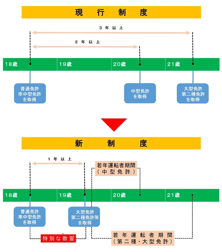 上記特例教習のうち、年齢要件に関する特例教習【①年齢課程または③年齢・経験課程】を受講して大型免許・中型免許・大型二種免許・普通二種免許等を取得した場合には、本来の受験資格要件が定める年齢(第二種免許・大型免許は21歳、中型免許は20歳)に達するまでの間は、若年運転者期間となります。