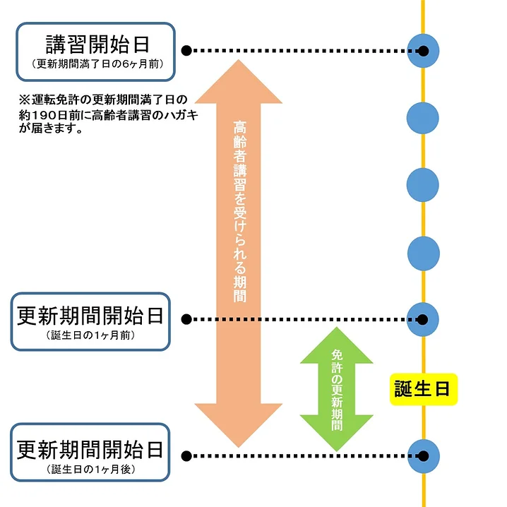 通知書が届いた方は、早めにお電話で予約をしてください。予約状況により受講希望日に添えない場合もあります。大変混雑しており、お電話をいただいてから2カ月以上先になる場合もあります。 - 免許証有効期間満了日の6カ月前から受講できますので、余裕をもってのお申込みをお願いします。
